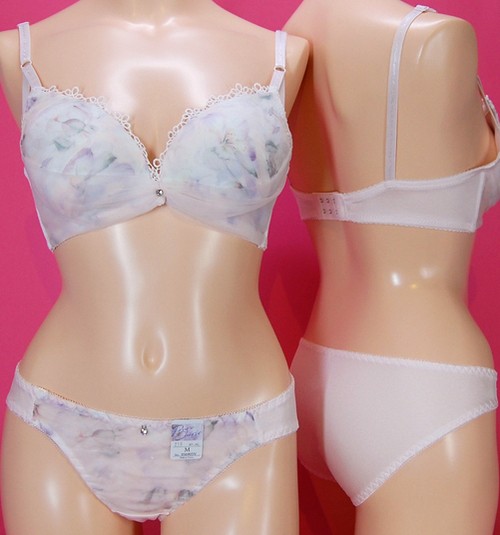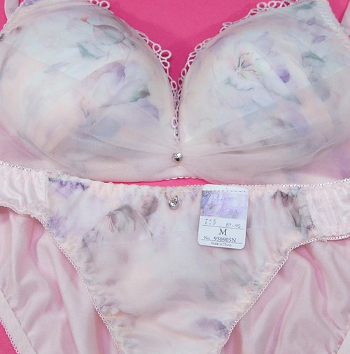 ノンワイヤー水彩フラワー被せチュールレースブラとショーツのセット